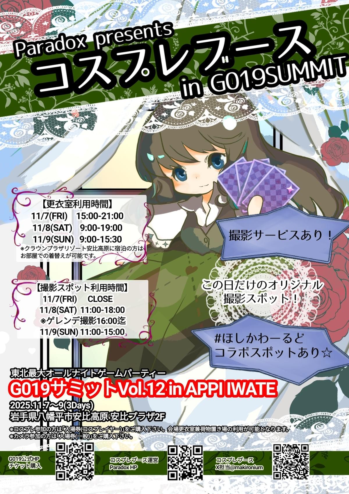 【2025/11/8~9開催】※撮影スポット、ゲレンデ撮影、撮影サービスなどのParadoxによるコスプレブースの活動は11/8.9の2日間となっております。※11/7(金)もコスプレでのイベント参加、更衣室利用は可能ですが、岩手e-sports協会の指示に従って下さい。注意事項はコスプレブースのルールに準じます。